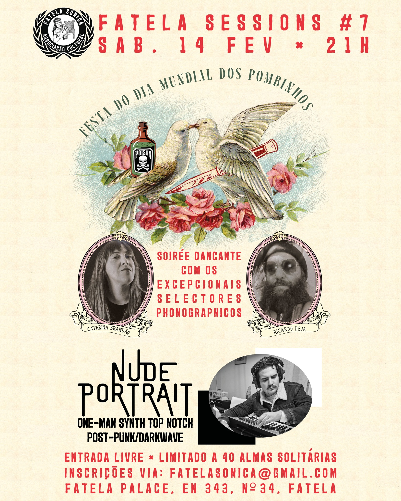 Apresentação do cartaz “Fatela Sessions #7” no dia 14 de Fevereiro de 2026, no Fatela Palace com os excepcionais selectores phonographicos Ricardo Beja (Punk), Catarina Brandão (Street Punk / Oi!) e Nude Portrait (One-Man Synth Top Notch Post-Punk / Dark Wave)